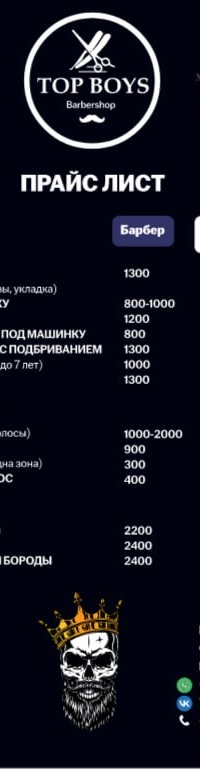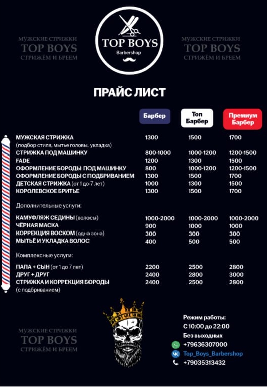 Top-Boys — одна из самых популярных барбершопов в Г.Клину. Здесь работают настоящие профессионалы, которые виртуозно улавливают пожелания клиента, даже если они выражаются в весьма неопределённой форме (например, «как у того актёра, ну, в том фильме»). В барбершопах используются качественные английский, итальянский косметические средства, которые при желании можно купить для личного пользования, в этом вам поможет мастера!